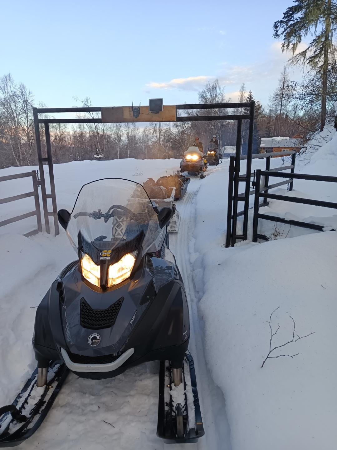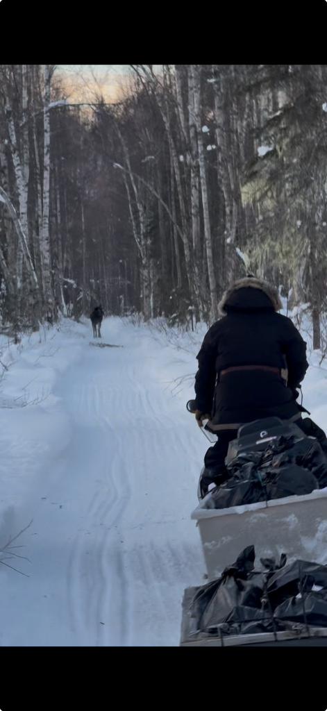 It’s been an interesting couple of weeks! Since we last chatted, our new neighbors made their virgin trip on their snow machines from town to our cabin. When it’s all new like that (the machine, the trail, how to strap everything down securely, etc.), it can be a real challenge. They called us about halfway and needed some help, so Kevin went out for the rescue…